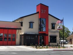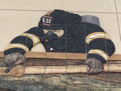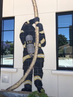 Around the Clock Response is a ceramic mural and translucent window public artwork created for Fire Station 37 in San José, CA. It presents firefighters at work and diversity within the firefighting community, with the female captain, depicted in the window, leading the crew. Children watch from below, dreaming of their futures as leaders. The window is illuminated with an astronomically timed lighting system from dusk to dawn.