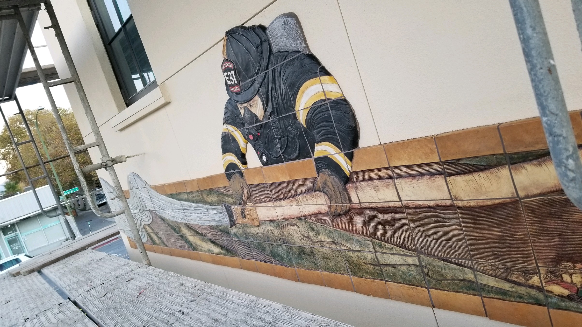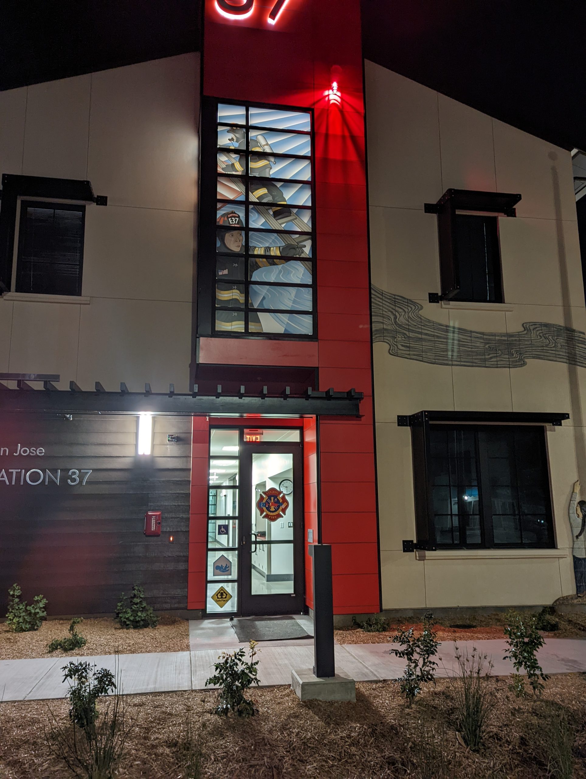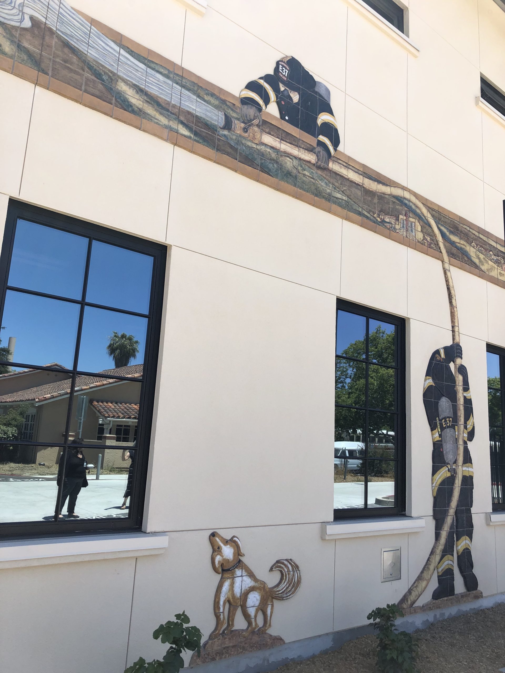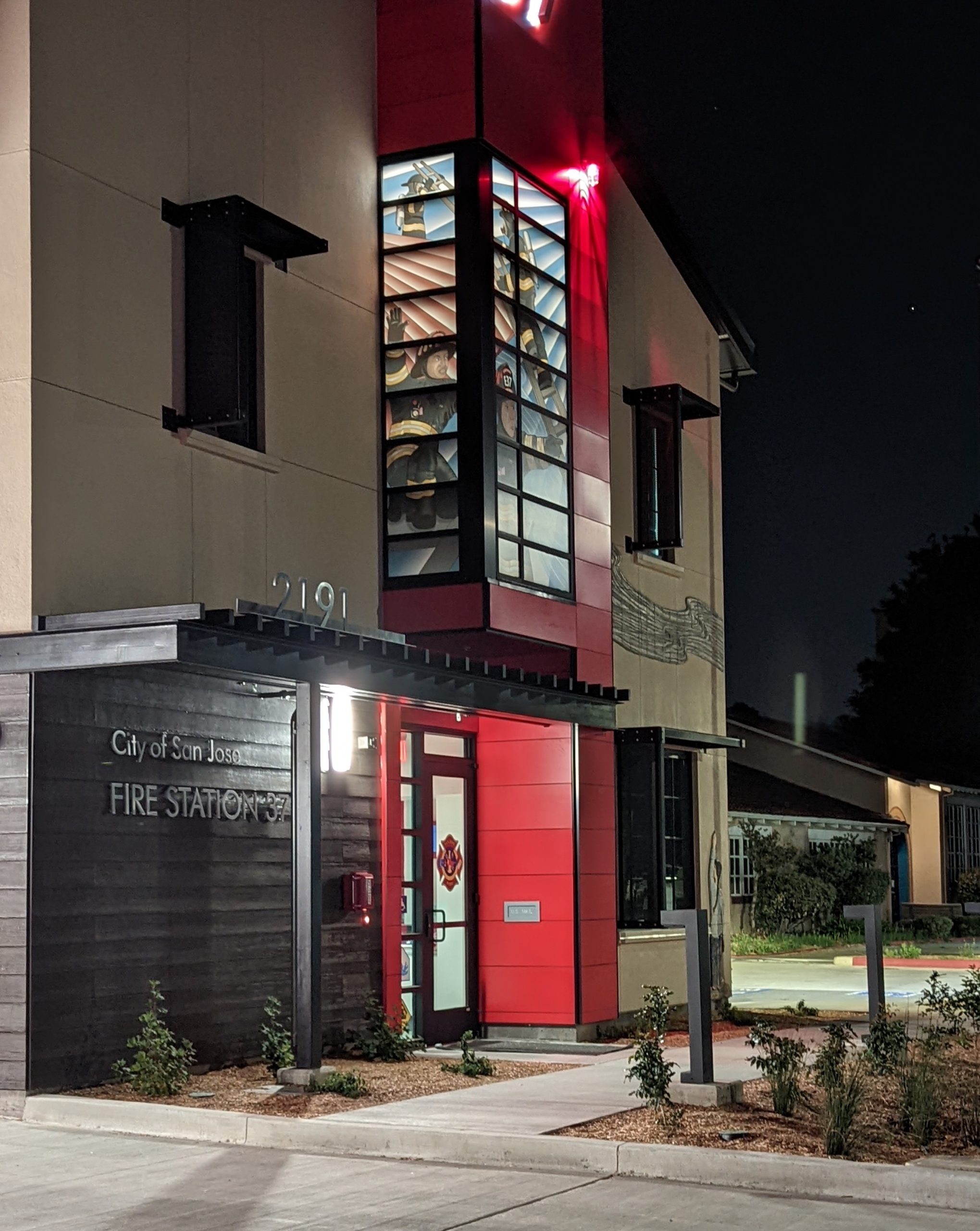 Around the Clock Response is a ceramic mural and translucent window public artwork created for Fire Station 37 in San José, CA. It presents firefighters at work and diversity within the firefighting community, with the female captain, depicted in the window, leading the crew. Children watch from below, dreaming of their futures as leaders. The window is illuminated with an astronomically timed lighting system from dusk to dawn.