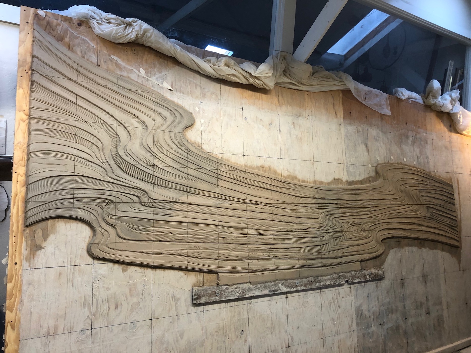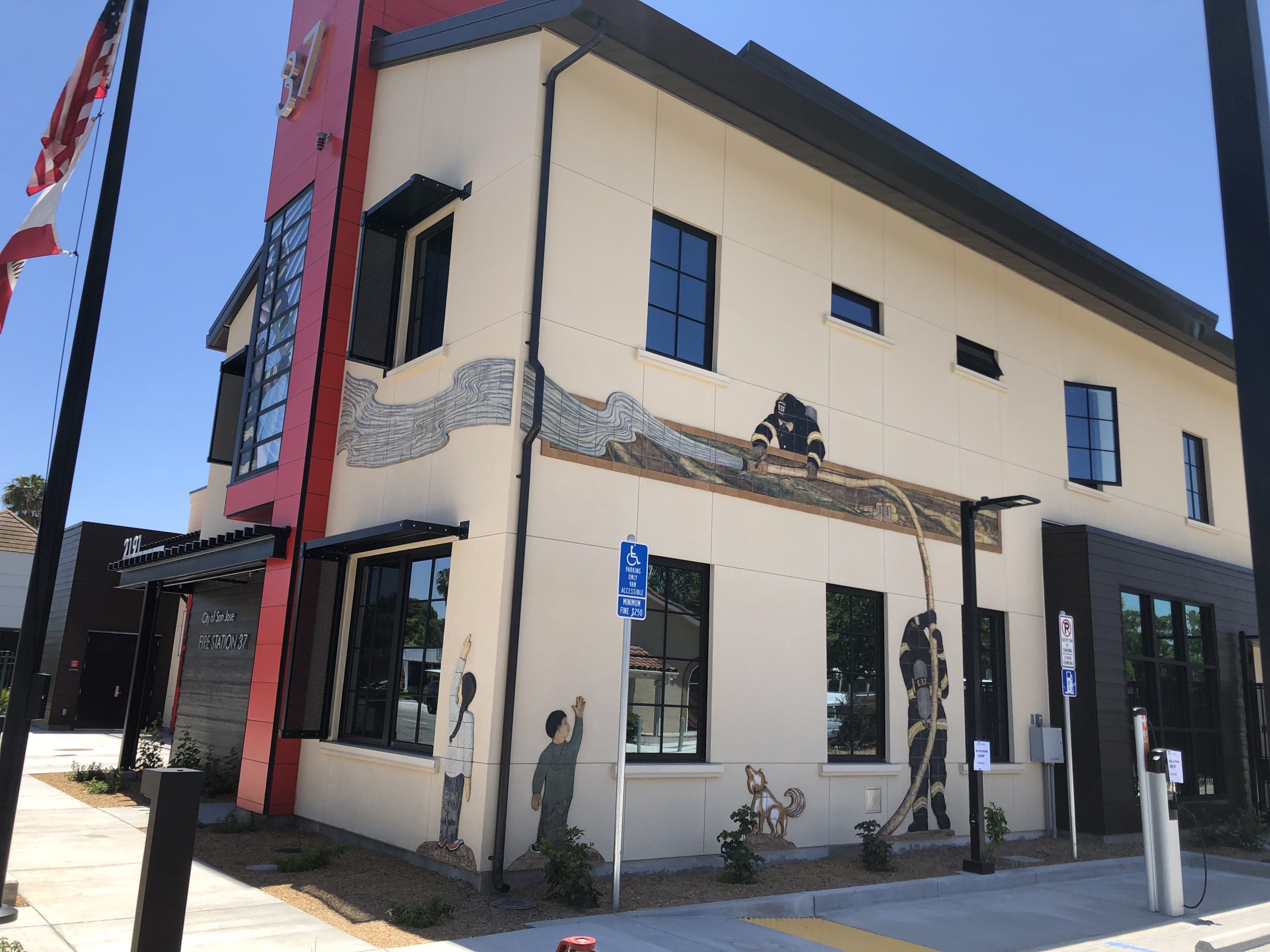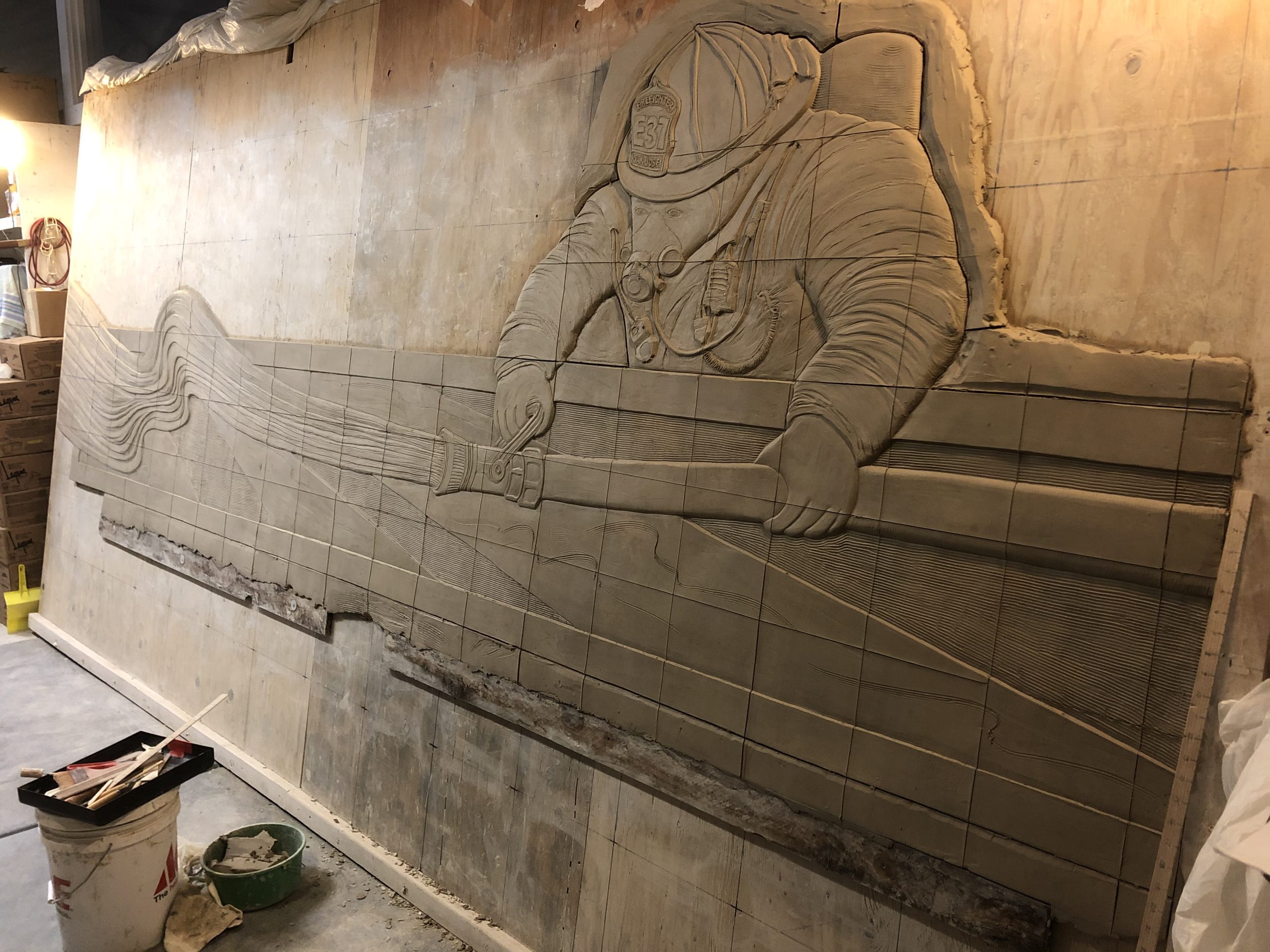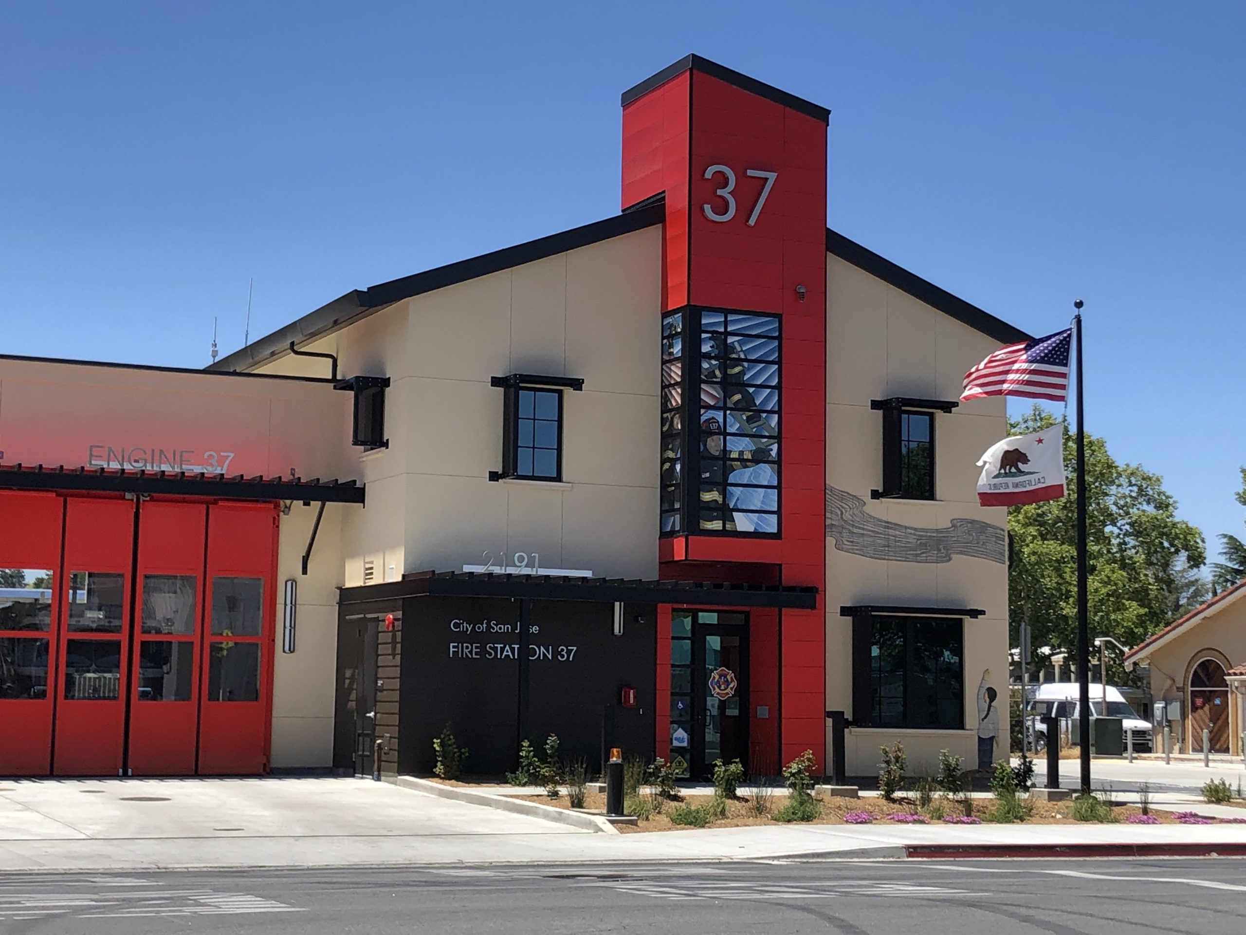 Around the Clock Response is a ceramic mural and translucent window public artwork created for Fire Station 37 in San José, CA. It presents firefighters at work and diversity within the firefighting community, with the female captain, depicted in the window, leading the crew. Children watch from below, dreaming of their futures as leaders. The window is illuminated with an astronomically timed lighting system from dusk to dawn.