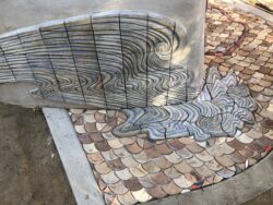 Adjacent to Fire Station 41 is a small corner park on which the community designed and built a hay bale and stucco bench a number of years earlier. Artist Kristina Young and I were selected to collaboratively re-design this bench and space. We created this wrap-around tile artwork, Old Mary and the West Sac Goats to animate the bench with imagery pertinent to firefighting in West Sacramento.