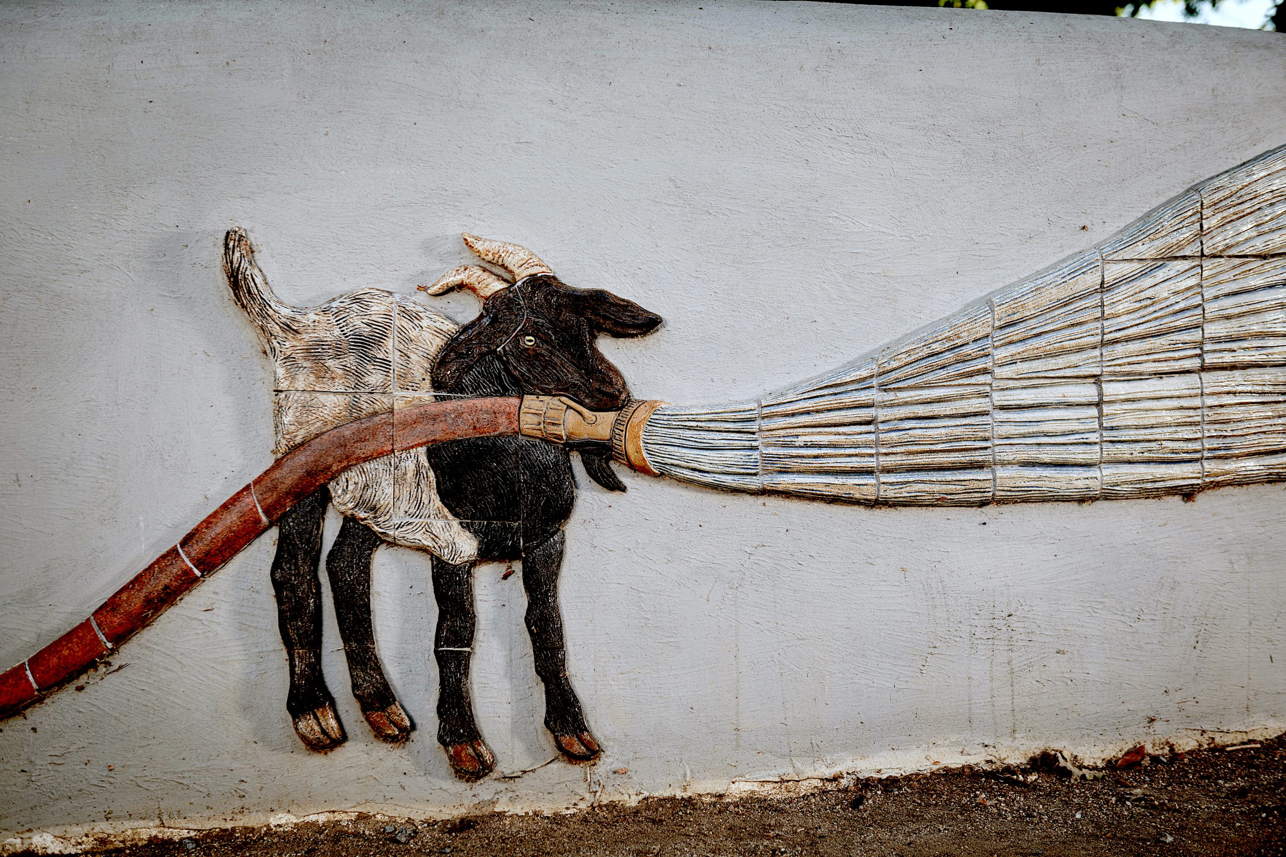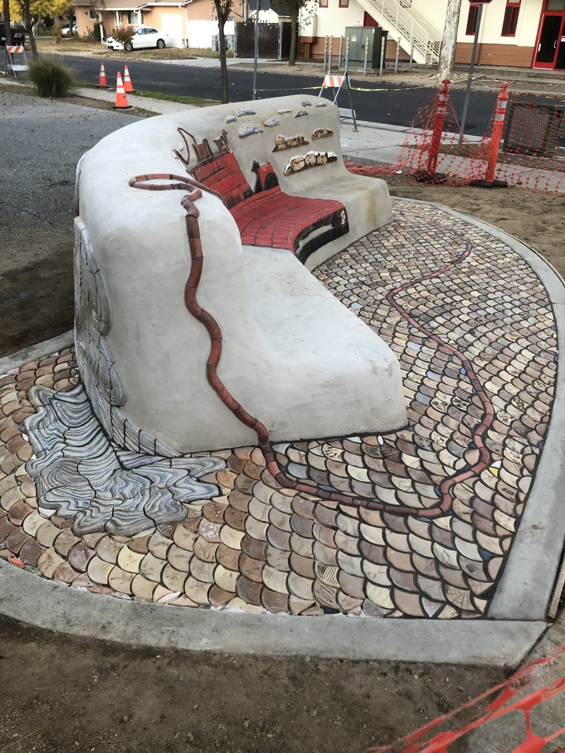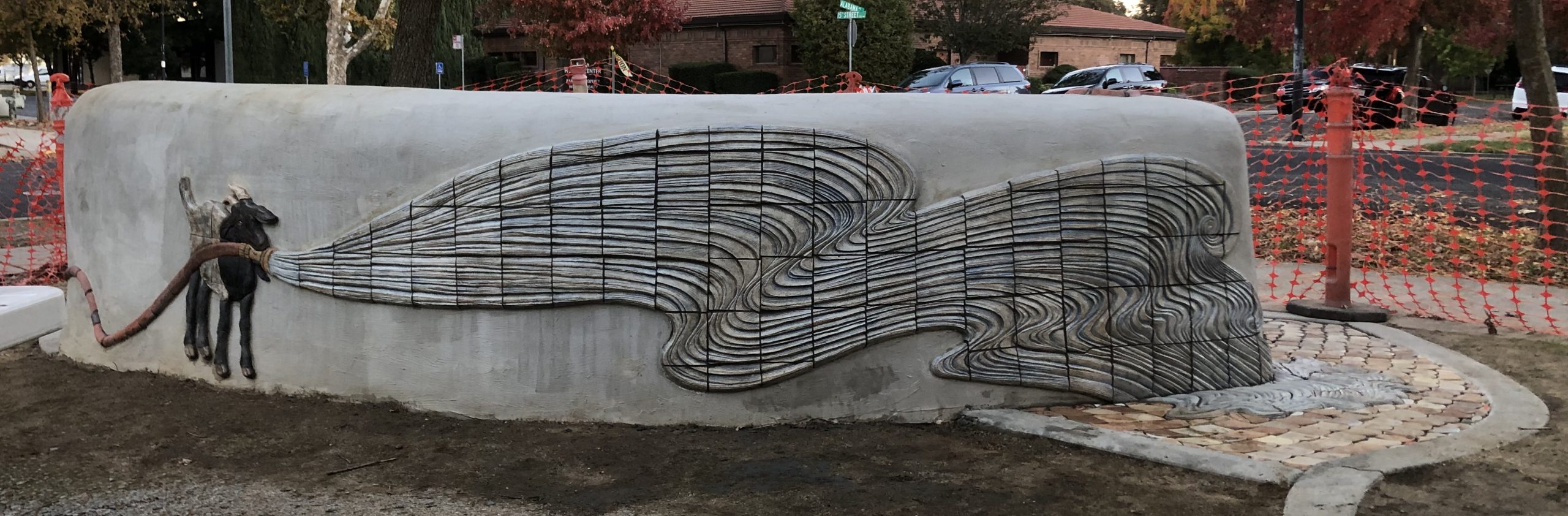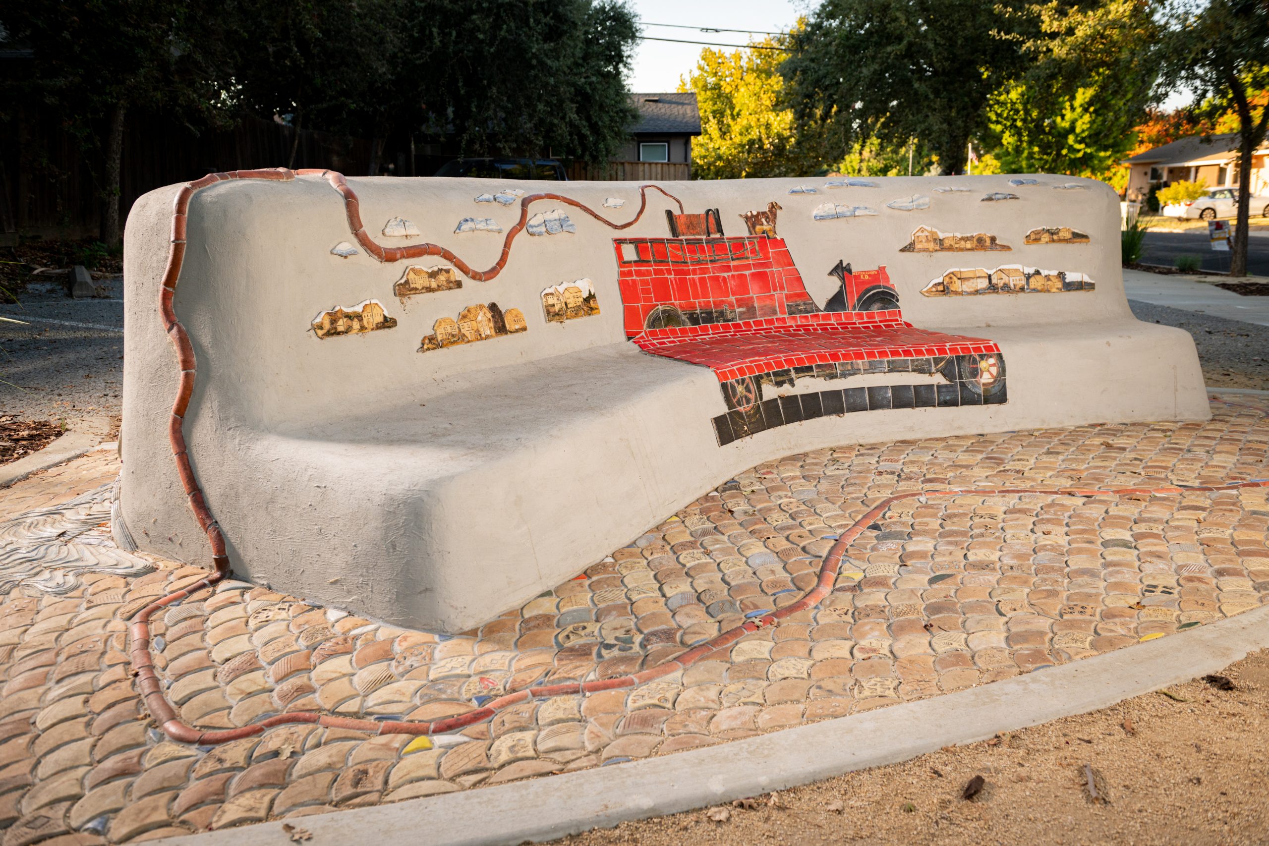 Adjacent to Fire Station 41 is a small corner park on which the community designed and built a hay bale and stucco bench a number of years earlier. Artist Kristina Young and I were selected to collaboratively re-design this bench and space. We created this wrap-around tile artwork, Old Mary and the West Sac Goats to animate the bench with imagery pertinent to firefighting in West Sacramento.