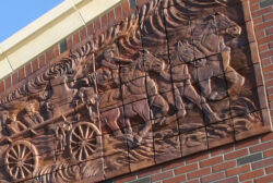 This façade for Fire Station 20 in Sacramento portrays the history of firefighting in the region. The terracotta tile mural was designed to blend with the classic style and color of the brick architecture.