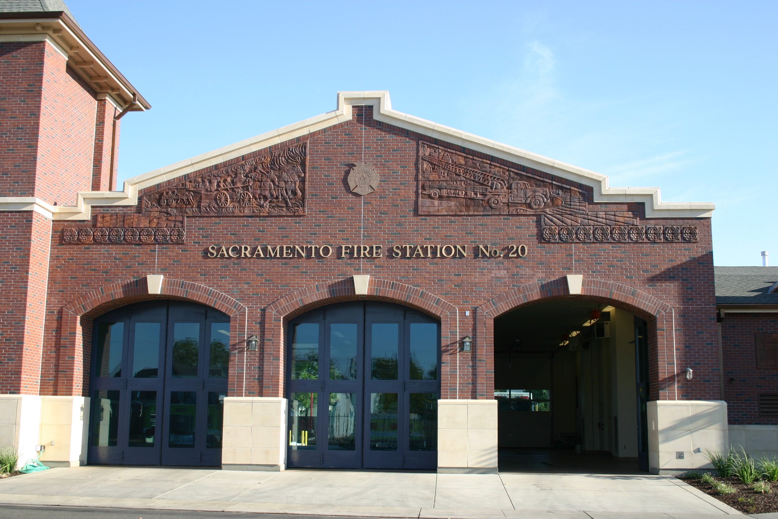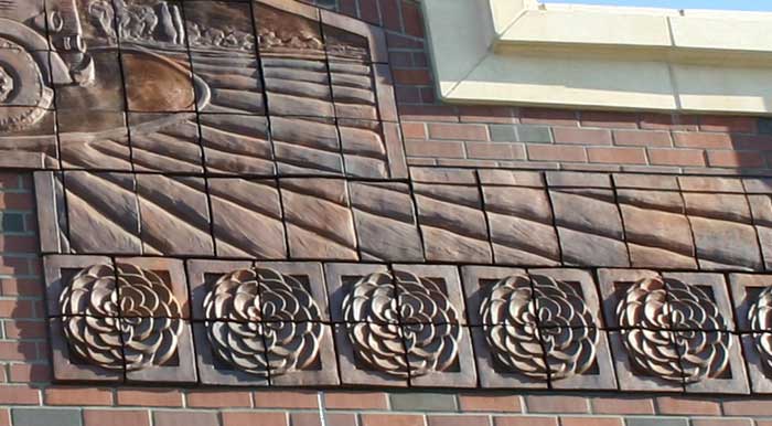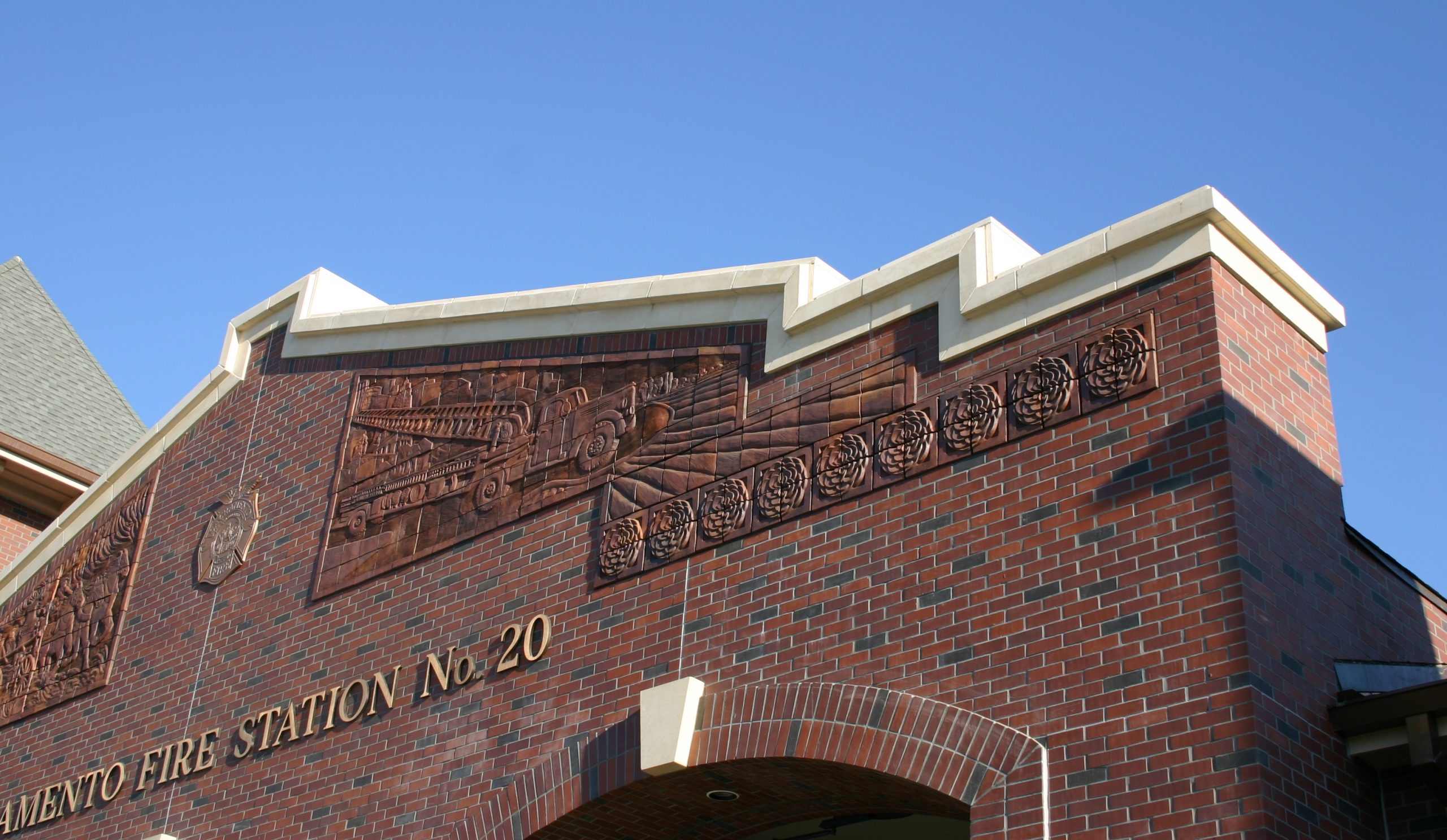 This façade for Fire Station 20 in Sacramento portrays the history of firefighting in the region. The terracotta tile mural was designed to blend with the classic style and color of the brick architecture.