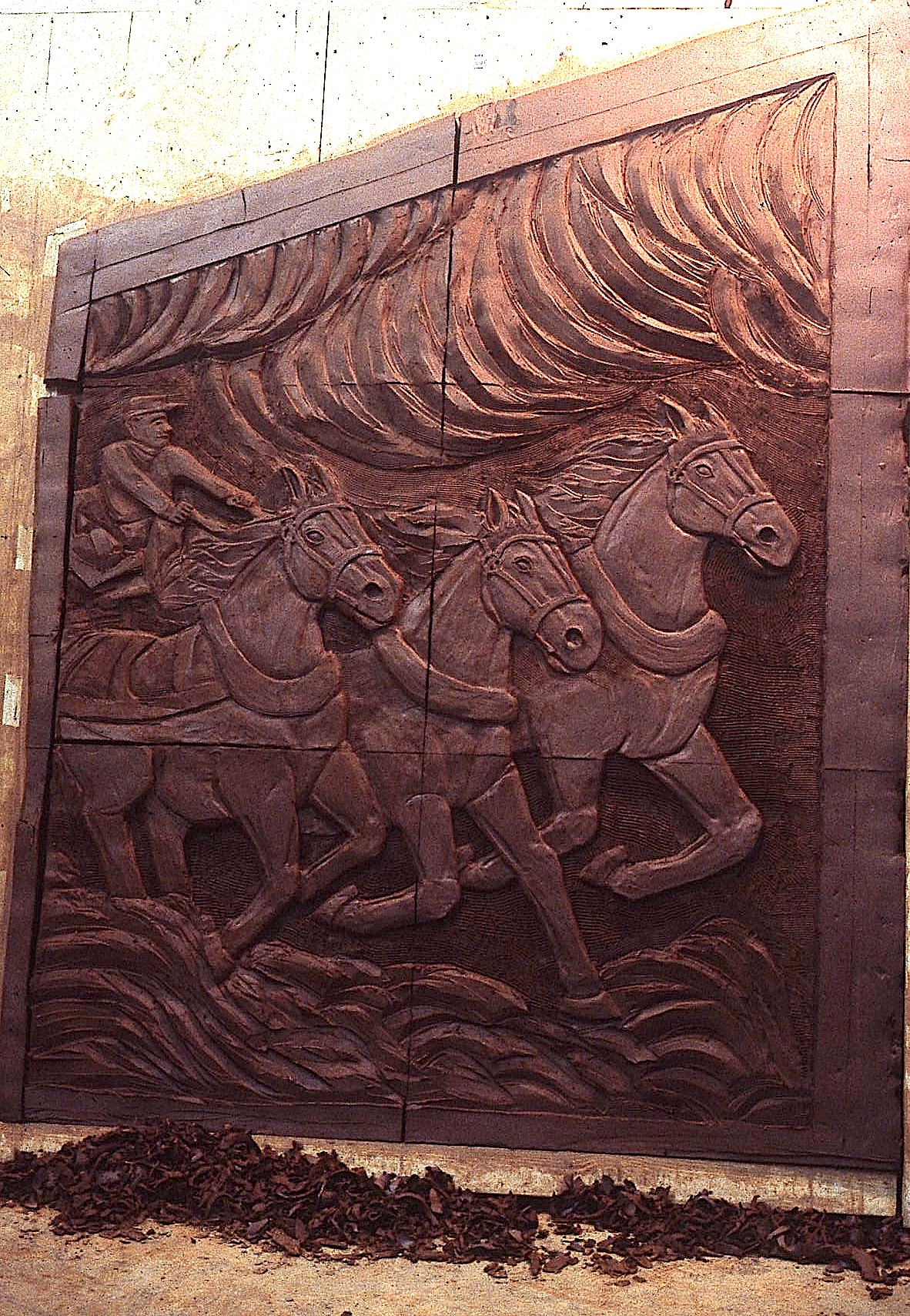 Seven sculpted terracotta panels, each of varying sizes, present historical images. The work is designed to honor the firefighters who risk their lives in the protection of the community.