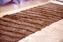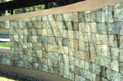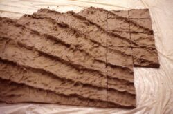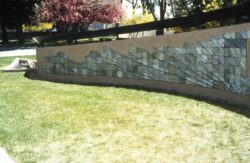 The students at NMSD, many of whom were Native American, helped plan the shape and location of the fountain. It was decided that the design should be a cascading wall in the center of a grassy courtyard, in the shape of a Pueblo heartline motif. Once this was defined, I planned the tilework for both sides of the wall. We created a wave pattern emphasizing the rhythm, crest and flow of a river for one side. The other side carries the words from Meridel LeSueur’s poem“Make the Earth Bright, and Thanks” stamped into wet clay tiles by the students.