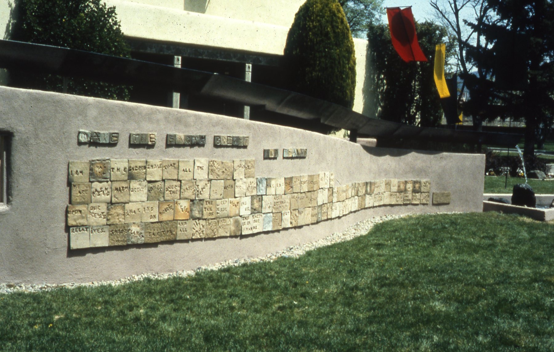 The students at NMSD, many of whom were Native American, helped plan the shape and location of the fountain. It was decided that the design should be a cascading wall in the center of a grassy courtyard, in the shape of a Pueblo heartline motif. Once this was defined, I planned the tilework for both sides of the wall. We created a wave pattern emphasizing the rhythm, crest and flow of a river for one side. The other side carries the words from Meridel LeSueur’s poem“Make the Earth Bright, and Thanks” stamped into wet clay tiles by the students.