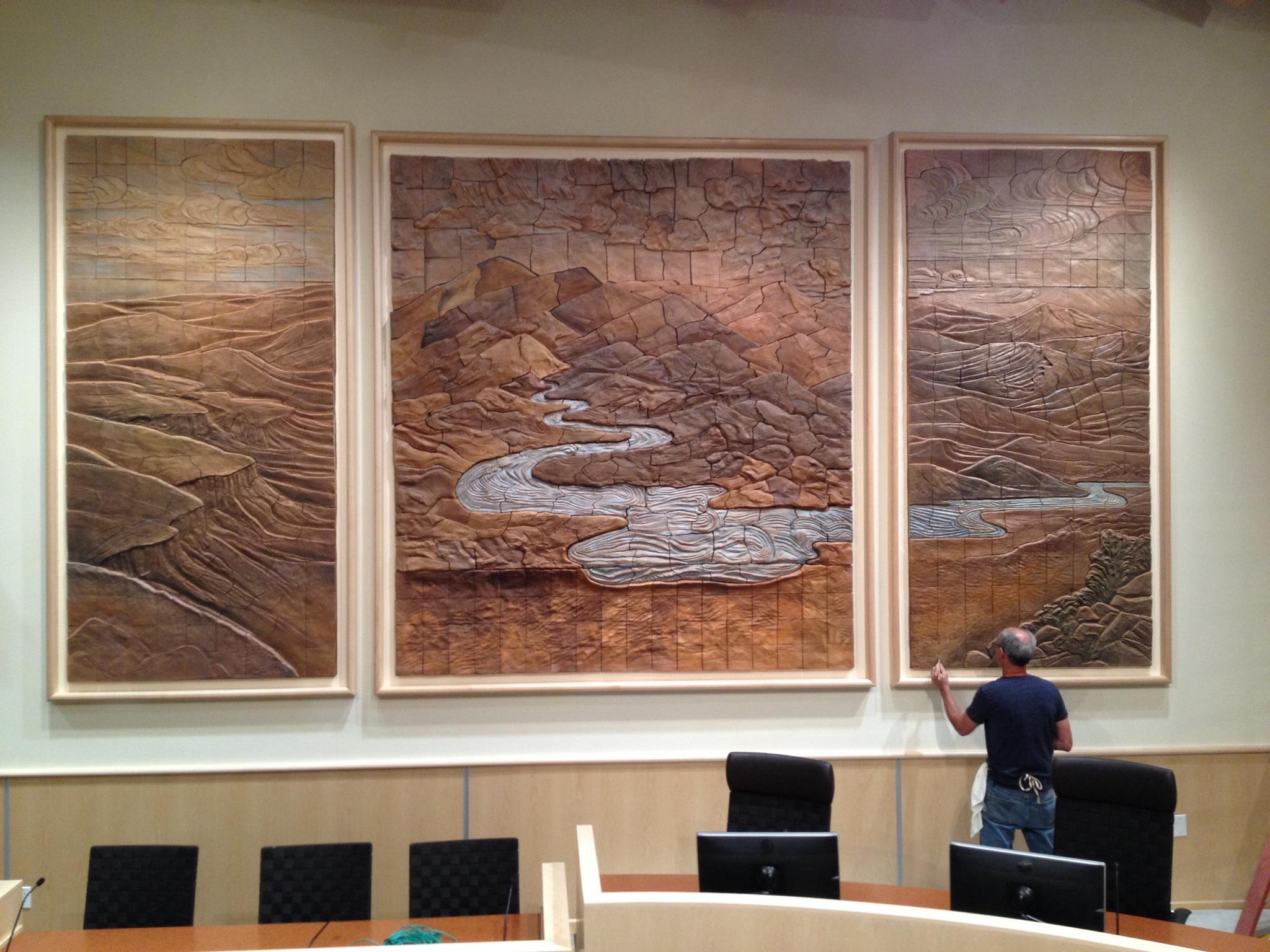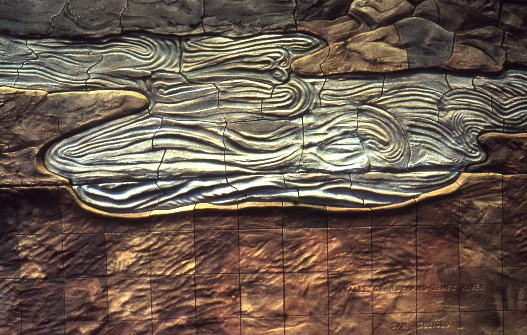 This terracotta mural responds to the environment of Los Alamos. In this part of the state there are two realities: one is the incredibly pristine valley (Valle Grande) encircled by the enormous volcanic caldera of the Jemez Mountains from which the river flows; the second is the high technology research and development industry. The contrast set my intent down in the most pastoral of all possible worlds: the delicately balanced valley within the crater, full of babbling springs, rolling hills and dramatic canyons. The choice of a landscape format stretching across the large room visually dissolves the static wall. The approach may be subtle, but when seen as a “backdrop” opening the space behind the speaker’s podium in the council chambers where broad ranging issues are discussed, the image symbolizes our stewardship of the wilderness behind the walls.